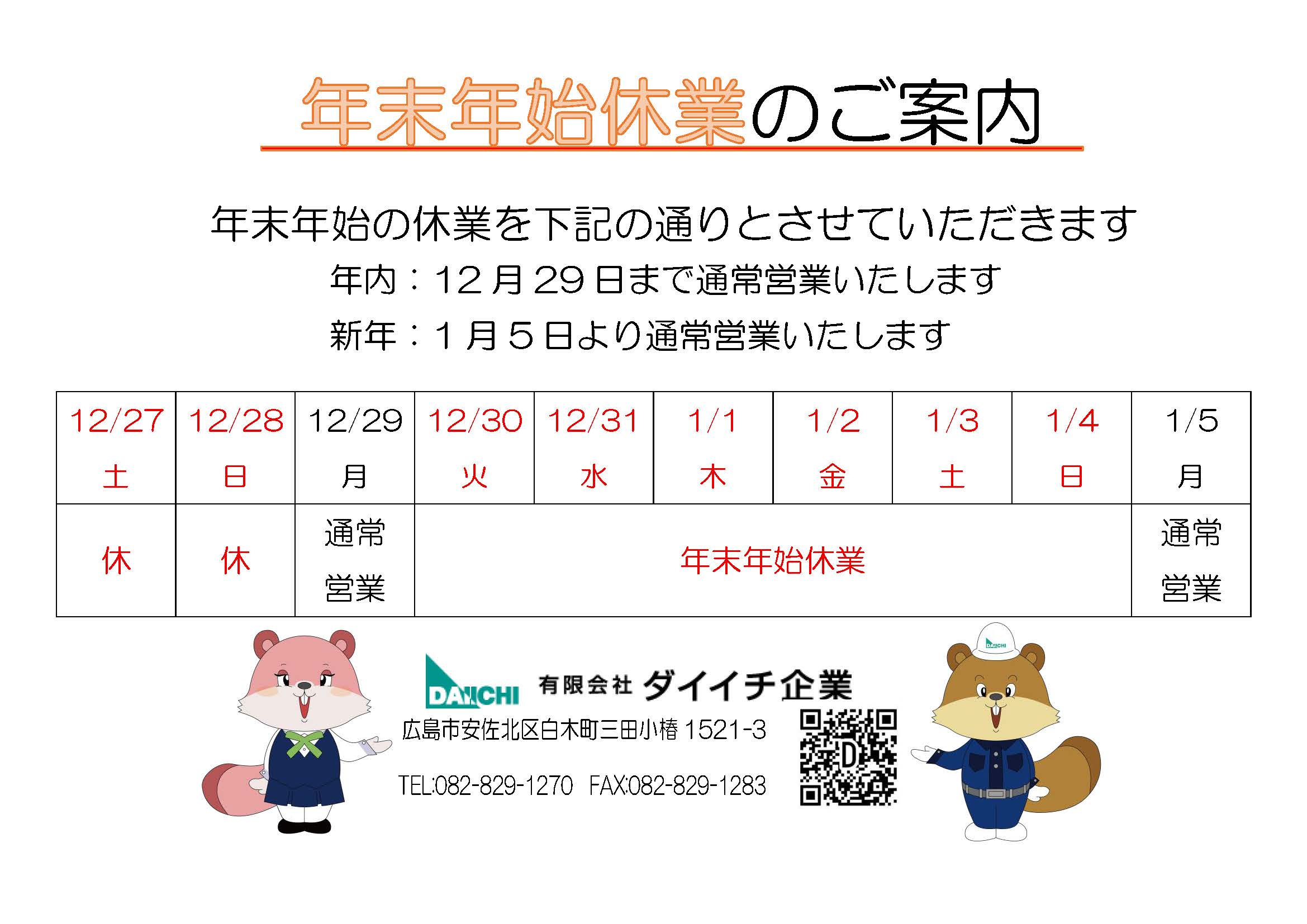 年末年始休業のお知らせ 2025 11/04 お知らせ ブログ 2025年11月4日 いつも産業廃棄物処理や解体工事でダイイチ企業をご利用いただき、ありがとうございます。 朝晩は寒い日も増えてきて、あの暑かった夏が嘘みたい!ダイイチ企業事務所前のモミジも、とてもきれいに色づきました! ダイイチ企業では、年末年始の休業を以下の通り予定しています。これから慌ただしい時期になりますが、笑顔で営業いたしますので、どうぞよろしくお願いいたします。 お知らせ ブログ ISO14001 登録証更新 ダイイチタイムス95号 発行 関連記事 ダイイチタイムス95号 発行 2025年11月13日 ISO14001 登録証更新 2025年10月25日 「人的資本開示レポート」公開 2025年10月9日 臨時休業のお知らせ 2025年10月1日 9月14日 草刈り活動&バーベキュー! 2025年9月26日 ダイイチタイムス第94号 発行 2025年9月16日 「抗う者たち」の上映、始まりました! 2025年9月6日 夏季休業のお知らせ 2025年7月31日