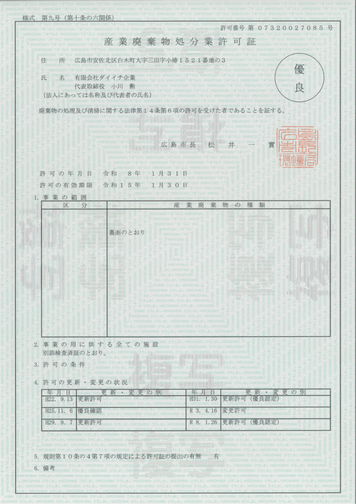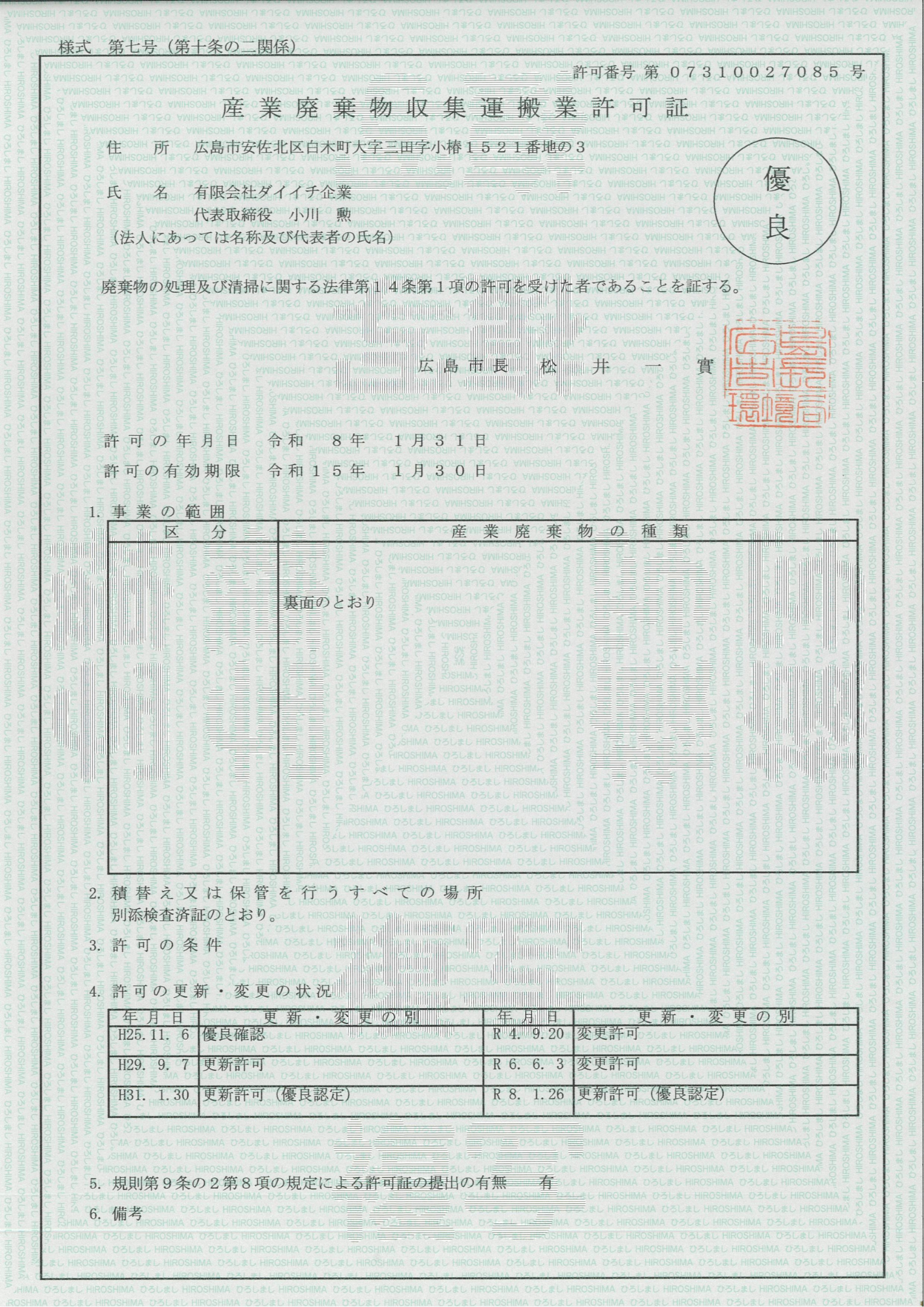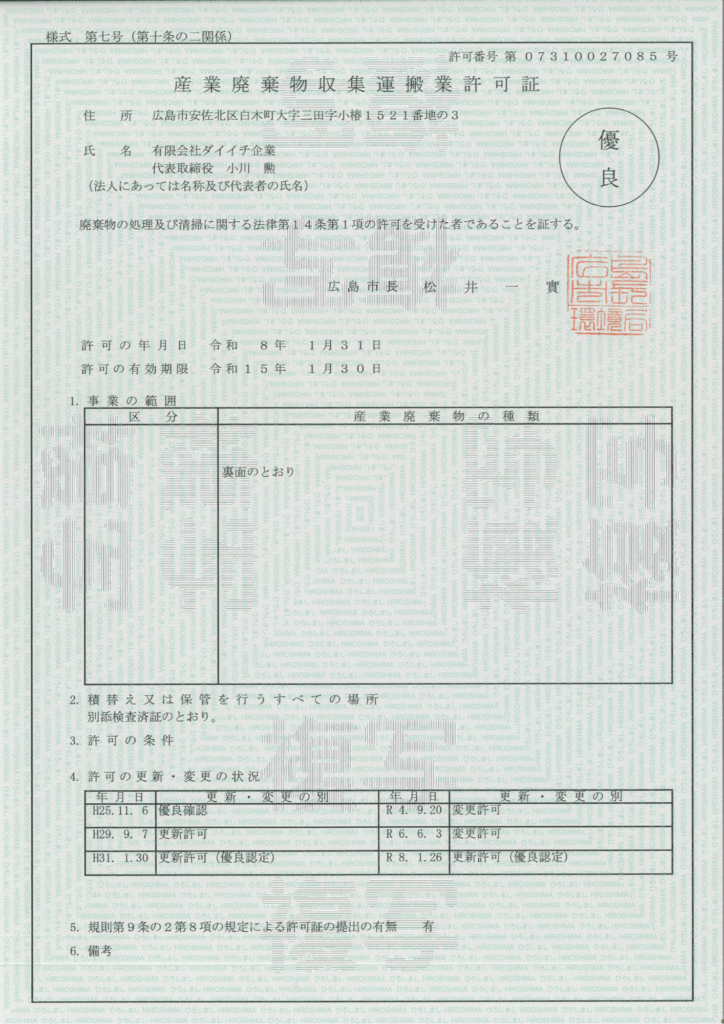 産業廃棄物収集運搬業許可証(広島市 許可)